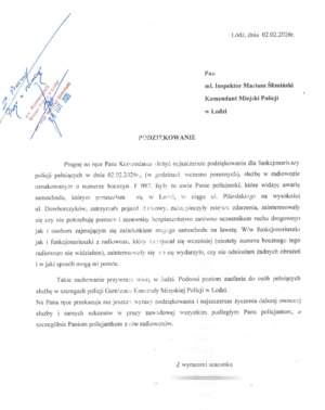 Pełniący obowiązki Komendanta Miejskiego Policji w Łodzi – mł. insp. Mariusz Ślimiński, pocztą elektroniczną, otrzymał list z podziękowaniem dla policjantek z Wydziału Ruchu Drogowego łódzkiej komendy. Każde miłe słowo motywuje nas do jeszcze skuteczniejszego działania na rzecz poprawy bezpieczeństwa mieszkańców naszego miasta.