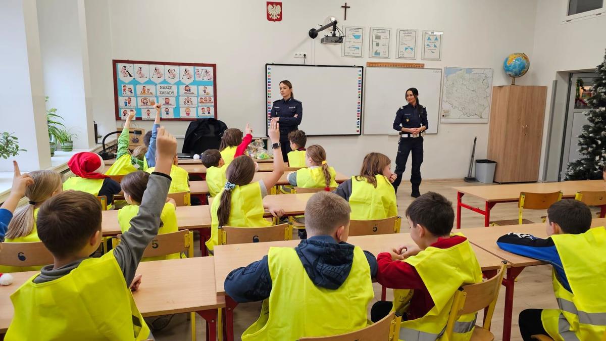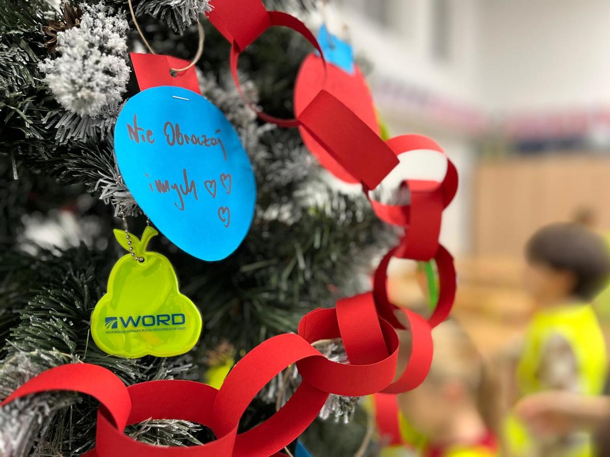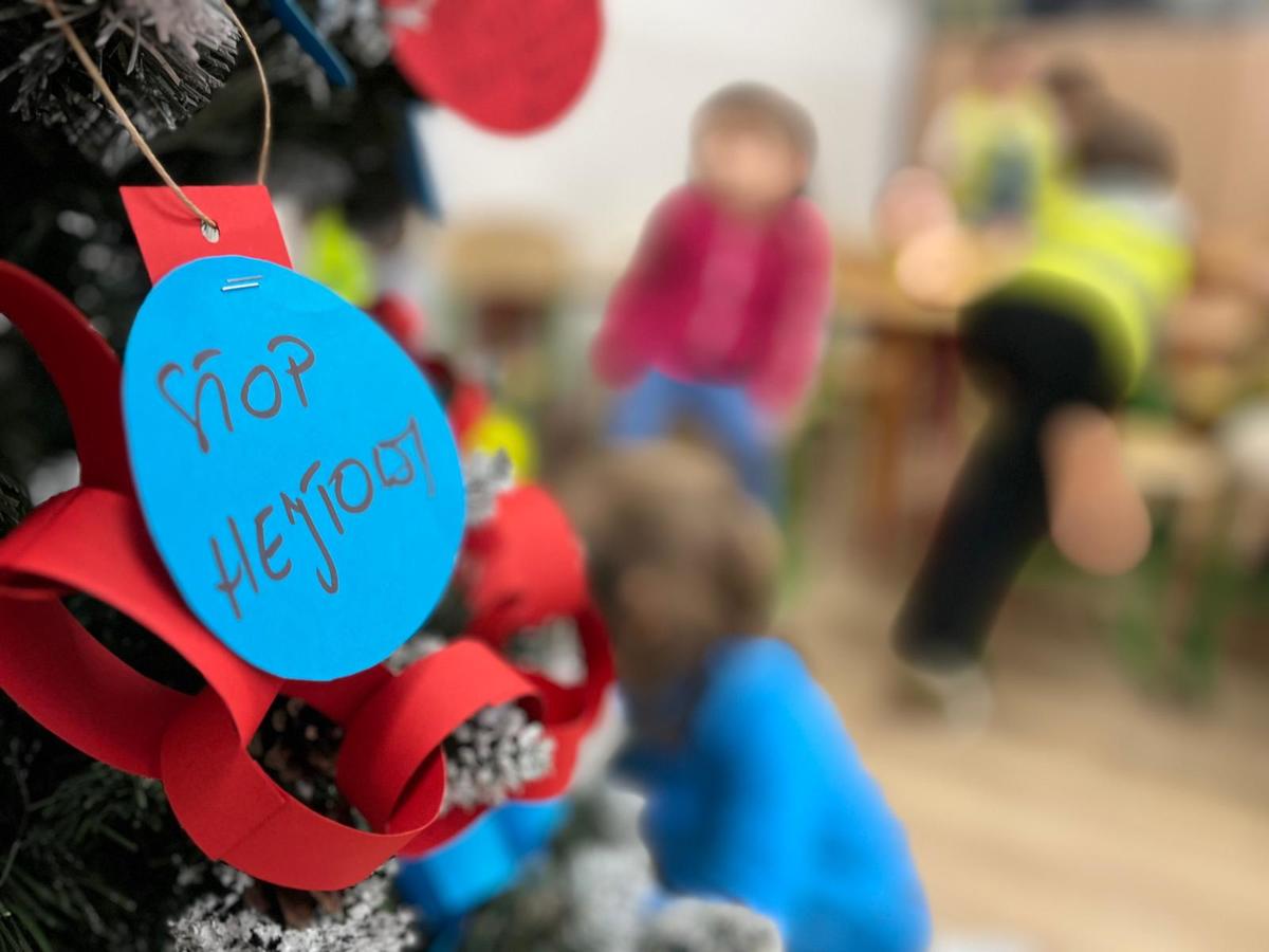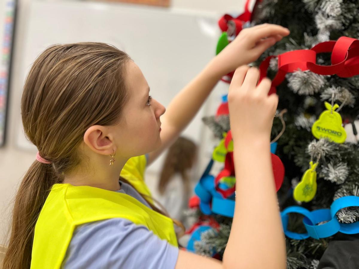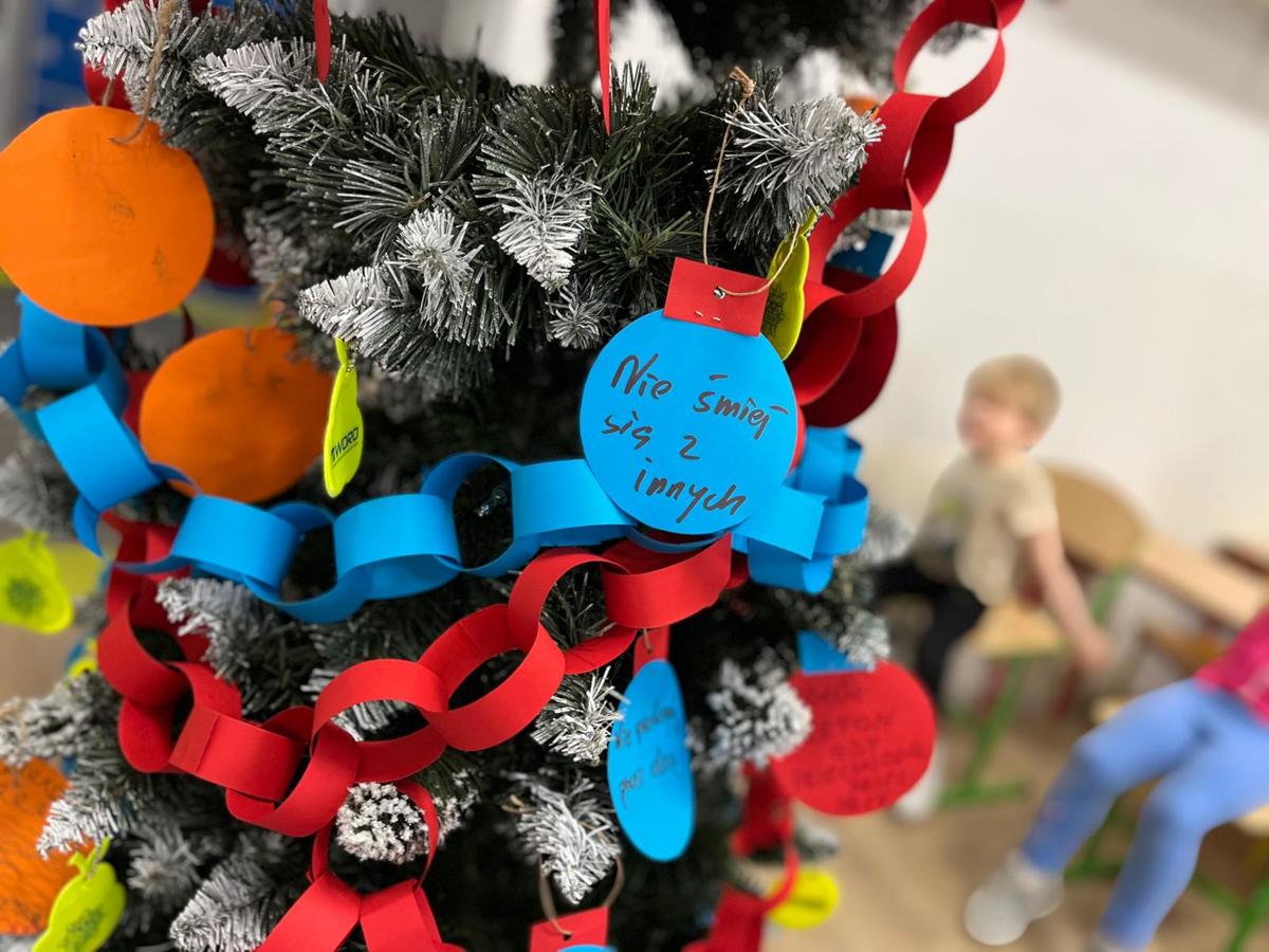 Podczas warsztatów dzieci wspólnie z policjantami tworzyły świąteczne łańcuchy oraz ozdabiały choinkę odblaskami, budując symboliczną „bezpieczną choinkę”. Uczniowie zapisywali także na kartonowych, kolorowych bombkach, własne hasła dotyczące szeroko rozumianego bezpieczeństwa – od noszenia odblasków po zasady bezpiecznego zachowania w domu, szkole i na drodze.