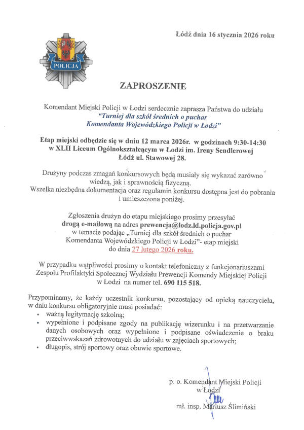 16 lutego 2026 roku, w auli Komendy Miejskiej Policji w Łodzi, odbyła się uroczysta zbiórka. Komendant Wojewódzki Policji w Łodzi nadinspektor Arkadiusz Sylwestrzak powierzył pełnienie obowiązków na stanowisku I Zastępcy Komendanta Miejskiego Policji w Łodzi nadkomisarzowi Michałowi Matysiakowi – dotychczasowemu Zastępcy Komendanta Miejskiego Policji w Łodzi, natomiast na stanowisku Zastępcy Komendanta Miejskiego Policji w Łodzi – młodszemu inspektorowi Jarosławowi Janusowi, który do tej pory był naczelnikiem Wydziału Konwojowego w Komendzie Wojewódzkiej Policji w Łodzi.