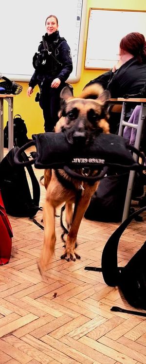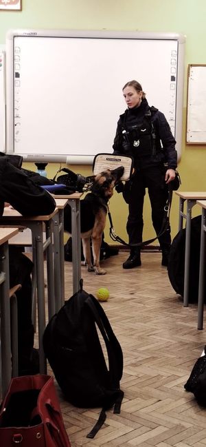 Mundurowi opowiedzieli, na czym polega ich praca oraz w jaki sposób wykorzystywane są umiejętności ich pupili w codziennej służbie. Uczniowie dowiedzieli się, że policyjni przewodnicy od lat ze swoimi czworonogami pomagają w wykrywaniu śladów na miejscu zdarzenia, ujawnianiu narkotyków, materiałów niebezpiecznych czy tropieniu, a specjalnie wyszkolone czworonogi wspomagają policjantów w trakcie codziennych patroli. Dowiedzieli się również, że zanim zwierzę zostanie przekazane do służby, musi przejść odpowiednie szkolenie pod okiem specjalistów z ośrodka w Sułkowicach.