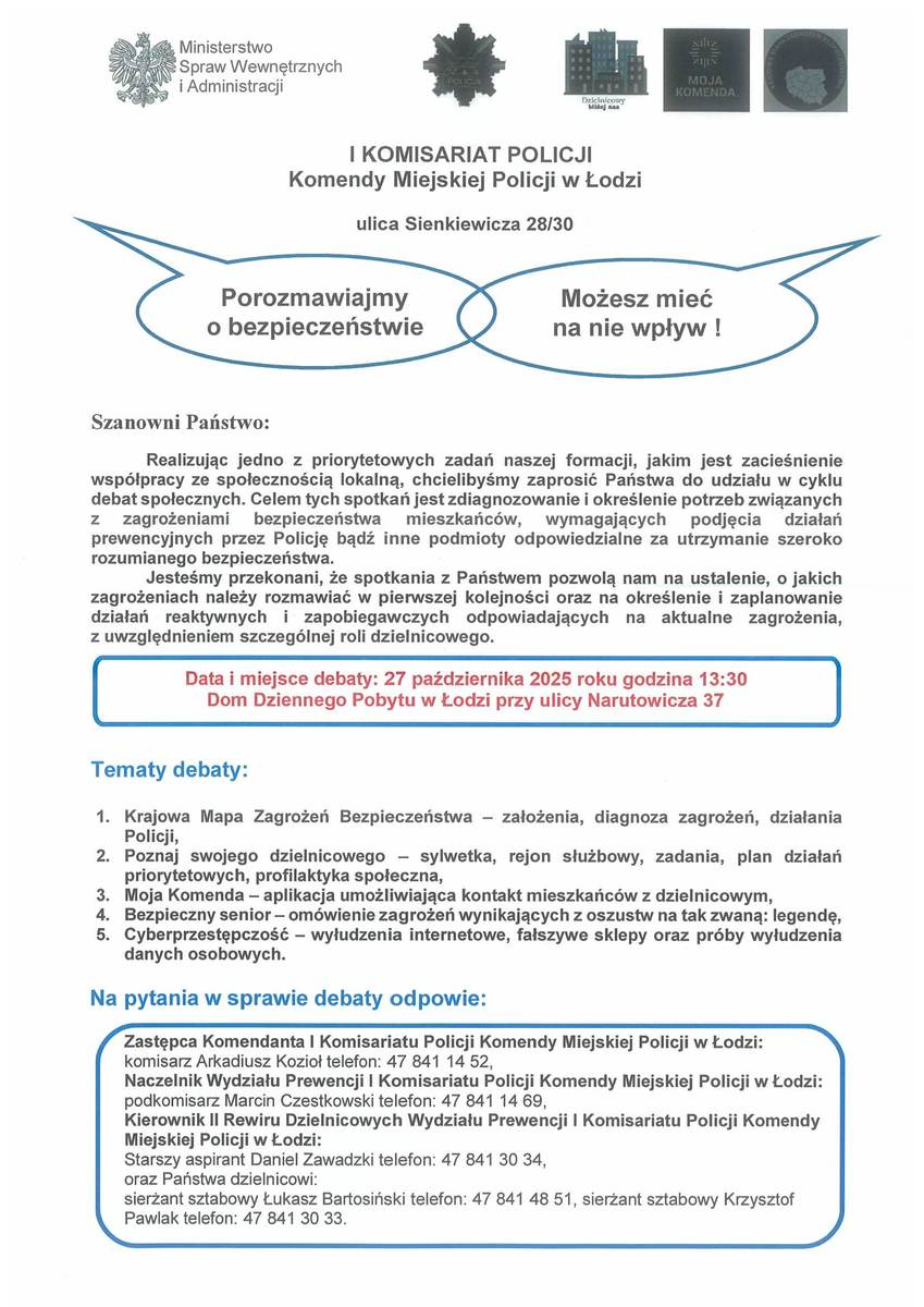Komendant I Komisariatu Policji Komendy Miejskiej Policji w Łodzi zaprasza na debatę społeczną w dniu 27 października 2025 roku