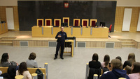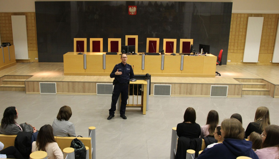 Po rozprawie funkcjonariusz Wydziału Prewencji Komendy Miejskiej Policji w Łodzi – podkomisarz Rafał Sobczak oraz pracownik cywilny Robert Mosiński przeprowadzili z uczniami spotkanie, podczas którego omówili podstawowe zagadnienia związane z odpowiedzialnością prawną nieletnich, zagrożeniem jakie niesie ze sobą przemoc rówieśnicza. To była wyjątkowa lekcja, podczas której młodzi ludzie mieli możliwość zadawania pytań policjantom. Mundurowy nie tylko odpowiadał na liczne pytania, ale także przybliżył specyfikę pracy łódzkich policjantów oraz zasady obowiązujące podczas procedury rekrutacyjnej. Takie spotkania uczniów z sędziami i funkcjonariuszami policji maja służyć temu, aby uchronić młodzież od negatywnych zachowań w życiu.
