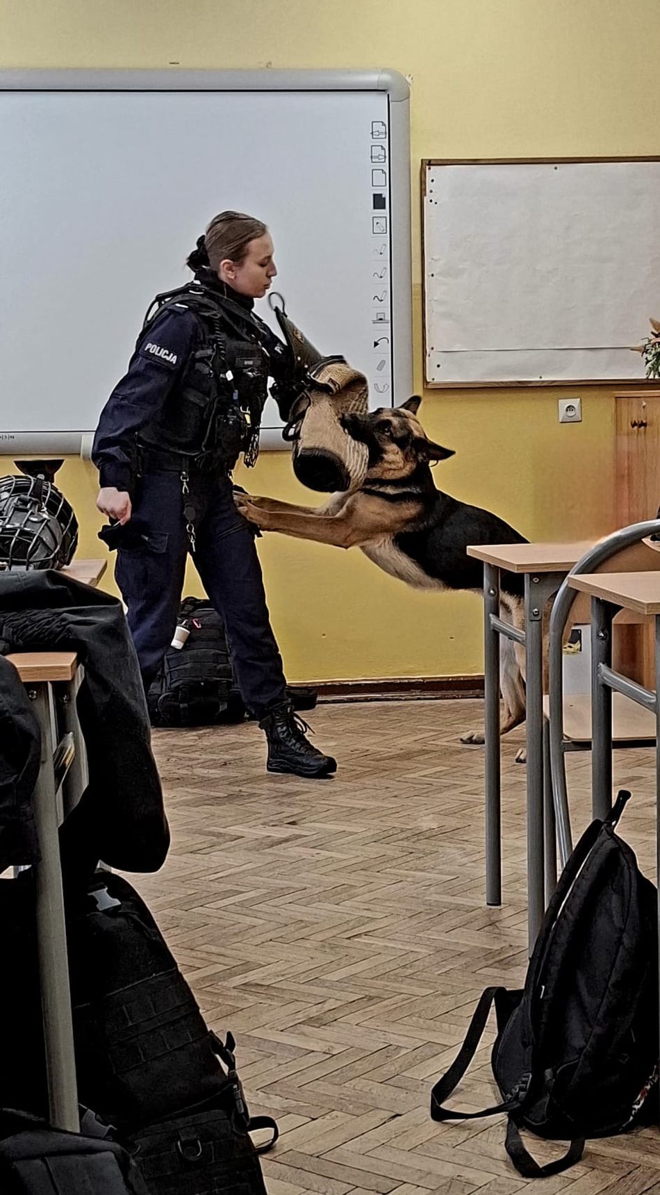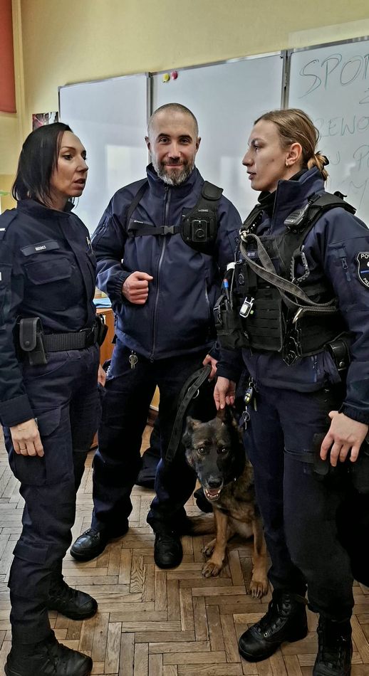Mundurowi opowiedzieli, na czym polega ich praca oraz w jaki sposób wykorzystywane są umiejętności ich pupili w codziennej służbie. Uczniowie dowiedzieli się, że policyjni przewodnicy od lat ze swoimi czworonogami pomagają w wykrywaniu śladów na miejscu zdarzenia, ujawnianiu narkotyków, materiałów niebezpiecznych czy tropieniu, a specjalnie wyszkolone czworonogi wspomagają policjantów w trakcie codziennych patroli. Dowiedzieli się również, że zanim zwierzę zostanie przekazane do służby, musi przejść odpowiednie szkolenie pod okiem specjalistów z ośrodka w Sułkowicach.